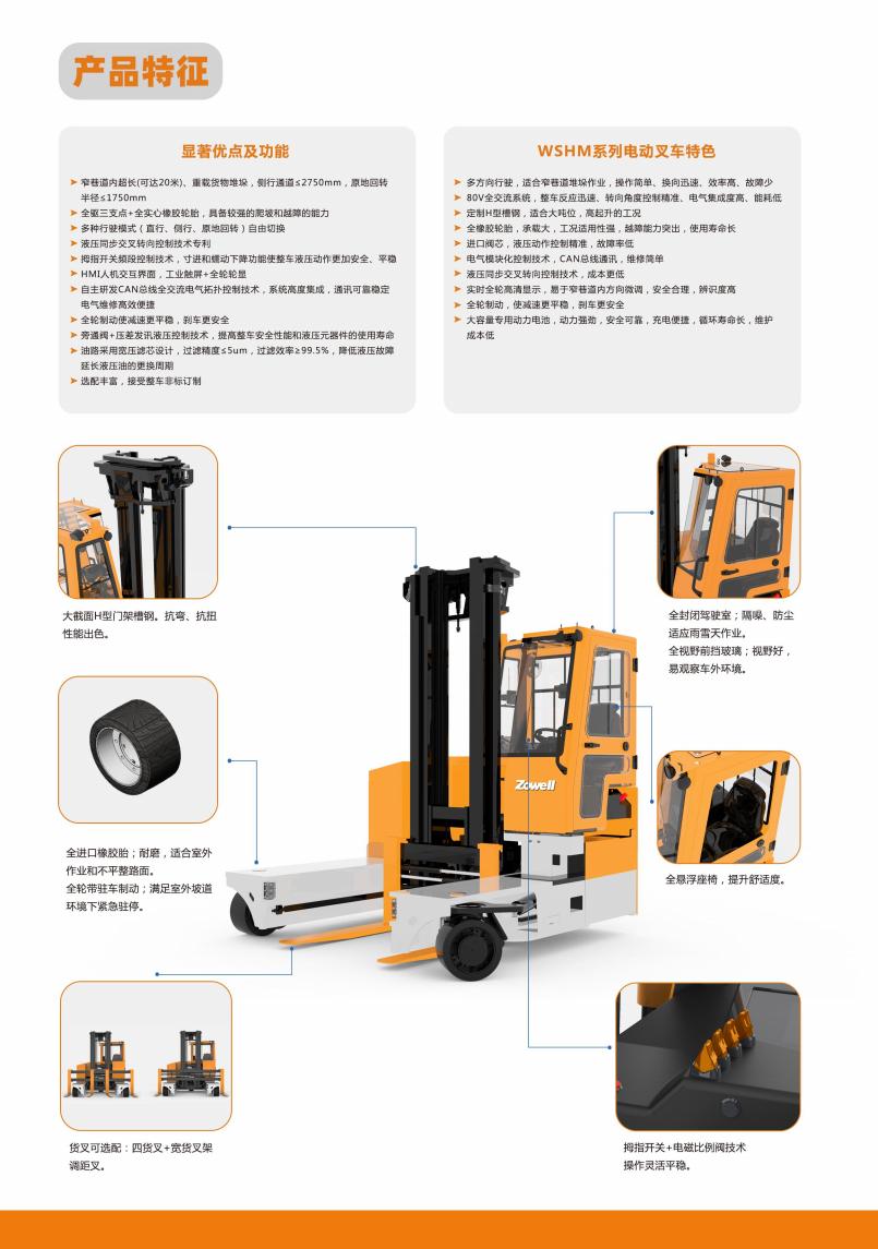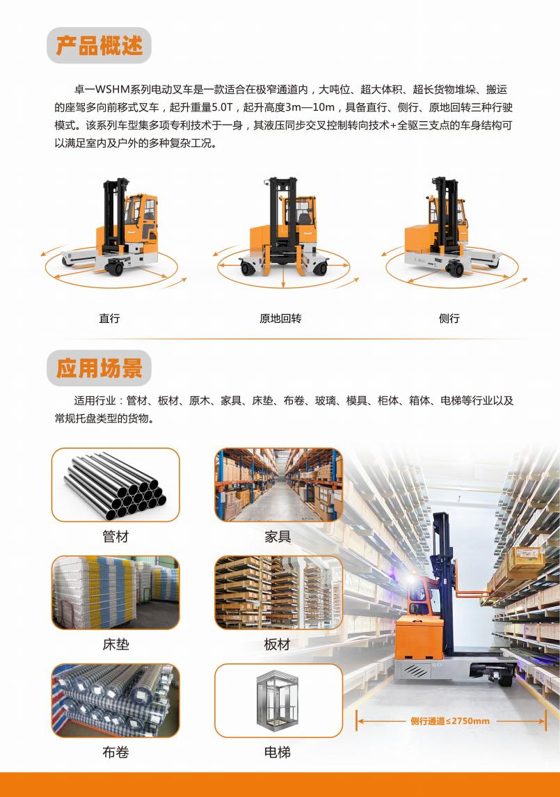 卓一WSHM系列电动叉车是一款适合在极窄通道内,大吨位、超大体积、超长货物堆垛、搬运的座驾多向前移式又车,起升重量5.0T,起升高度3m——10m,具备直行、侧行、原地回转三种行驶模式。该系列车型集多项专利技术于一身,其液压同步交叉控制转向技术+全驱三支点的车身结构可以满足室内及户外的多种复杂工况。