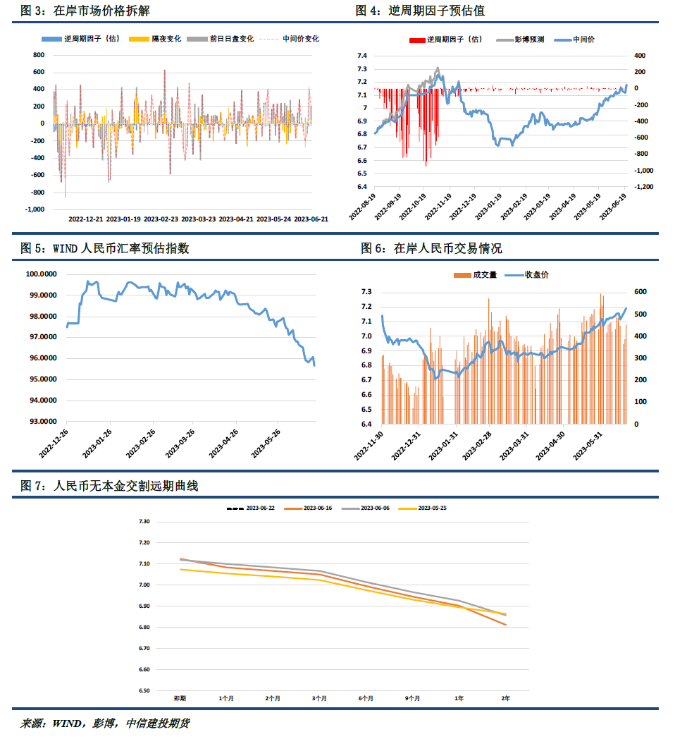 本周三,中间价报7.1795,较前一周变动229基点,即人民币对美元下跌229基点。跟踪期内,各因素对中间价走势的贡献为:日盘价格调整贡献485点,隔夜一篮子货币调整贡献-231点,逆周期因子预估贡献-25点。
