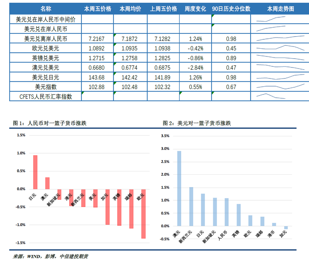本周人民币兑美元走弱,离岸人民币较上周贬值1.24%,最新汇率为7.2167。