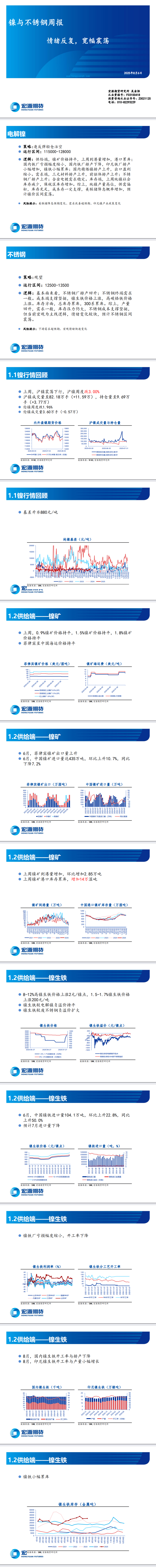 供给端,镍矿价格持平,上周到港量增加,港口累库;国内铁厂亏损幅度缩小,国内铁厂排产下降,印尼铁厂排产小幅增加,镍铁小幅累库;国内精炼镍排产上升,出口盈利缩小。需求端,三元材料排产上升,前驱体排产上升;不锈钢厂排产上升;合金电镀需求稳定。库存端,上周纯镍社会库存减少,保税区库存增加。综上,纯镍产量高位,供需偏松,库存充足,成本存一定支撑,美联储降息概率增加,预计镍价区间震荡。