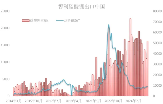 根据智利海关数据,2025年10月出口中国碳酸锂为16210.08吨,环比增加46.03%,同比下跌4.47%。出口均价9054.52美元/吨,环比涨价1.52%,同比增加18.94%。