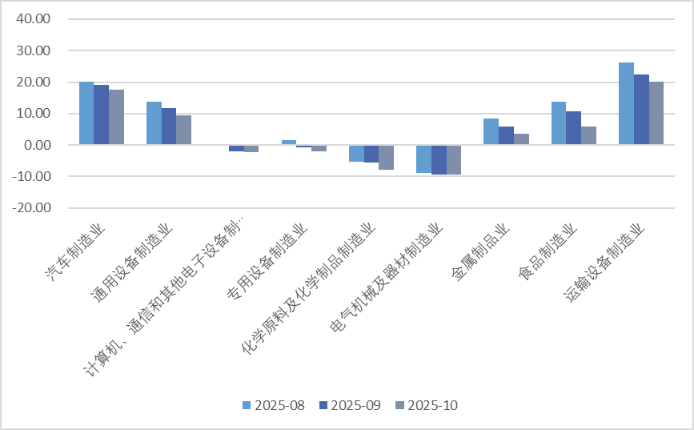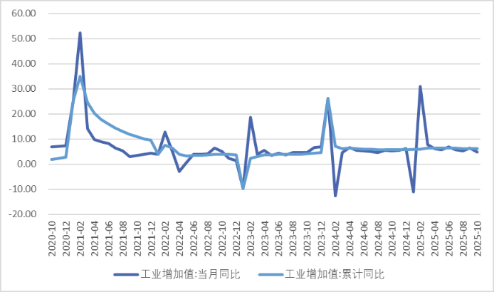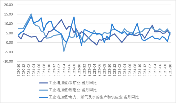 一、生产端超预期回落,外需拖累明显。10月份,全国规模以上工业增加值同比增长4.9%。分三大门类看,采矿业增加值同比增长4.5%,制造业增长4.9%,电力、热力、燃气及水生产和供应业增长5.4%。装备制造业增加值同比增长8%,高技术制造业增加值增长7.2%,增速分别快于全部规模以上工业3.1和2.3个百分点。装备制造业及高技术制造业持续对工业生产起到支撑。受贸易冲突再起的影响,10月份我国出口交货值同比下降2.1%,较9月份回落5.9个百分点,外需走弱拖累工业生产。分产品看,集成电路、新能源汽车、工业机器人等产品产量同比分别增长17.7%、19.3%、17.9%,维持高增速;新质生产力相关产业表现依旧强势。当地时间10月25日至10月26日,中美双方在吉隆坡举行会谈,双方就多项问题达成协议,其中包括美方取消10%芬太尼关税,并延长暂停24%对等关税时间1年;此外,美方暂停出口管制50%穿透性规则,中方也暂停稀土出口管制措施。至此,美国对华关税由此前的接近40%降至30%附近,后续外需拖累预计有所减弱。从四中全会对十五五规划建议看,十五五期间将实现科技自立自强水平大幅提高,后续政策着力点仍将集中在人工智能领域。