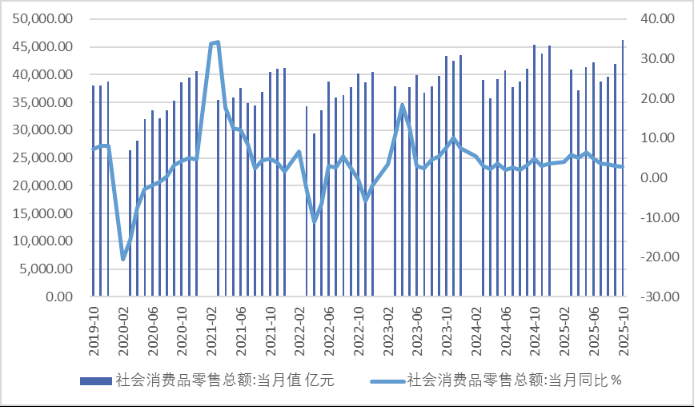 11月14日,国家统计局公布数据,10月规模以上工业增加值同比增长4.9%,预期5.2%,前值6.5%。固定资产投资同比下降1.7%,前值下降0.5%。基础设施投资同比下降0.1%,制造业投资增长2.7%,房地产开发投资下降14.7%。社会消费品零售总额同比增长2.9%,预期2.7%,前值3%。全国调查失业率5.1%,前值5.2%。