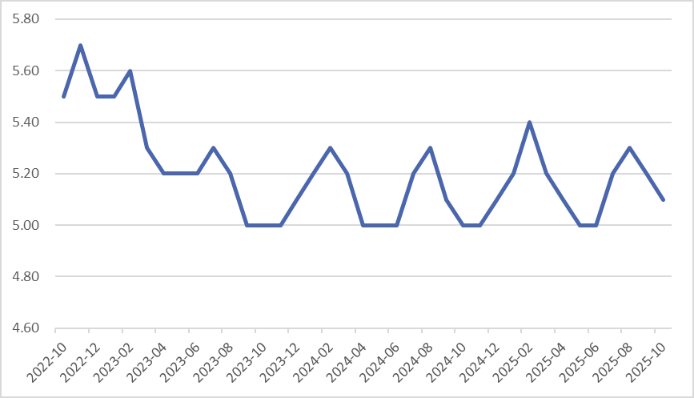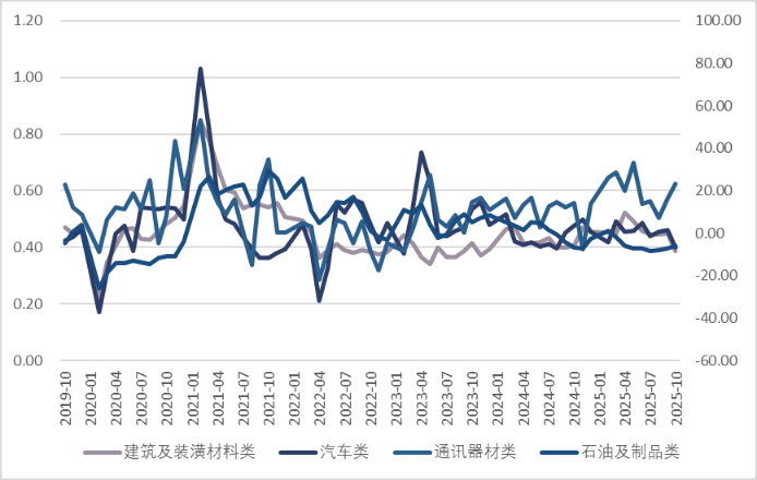 三、以旧换新商品消费力度减弱,中秋国庆双节合并提振服务消费。10月份,社会消费品零售总额同比增长2.9。其中商品零售增速放缓是主要拖累,受到旧换新政策效果减弱以及2024年四季度高基数影响,部分相关行业社零增速明显放缓,10月限额以上单位家具类、家用电器和音像器材类、文化办公用品类、通讯器材类商品零售额分别增长9.6%、-14.6%、13.5%、23.2%。服务零售保持增长态势,1-10月累计同比增速达5.3%,较上月加快0.1%。由于今年中秋国庆假期合并,工作日减少推动出行旅游等服务消费,10月份餐饮收入较9月大幅回升2.9个百分点至3.8%。整体来看,由于耐用品消费具有一定周期性,以旧换新此前已提前透支了部分商品消费需求,因此,后续消费动能将有所减弱。展望后市,“十五五”规划建议稿指出将政策重心由“恢复性消费”转向“升级型消费”,在供需两端同时着力,增强消费意愿,培育新型消费增长点。在政策导向高质量消费的背景下,后续居民消费或由基础的商品消费转向注重体验的服务型消费。