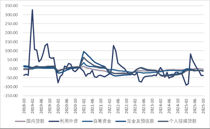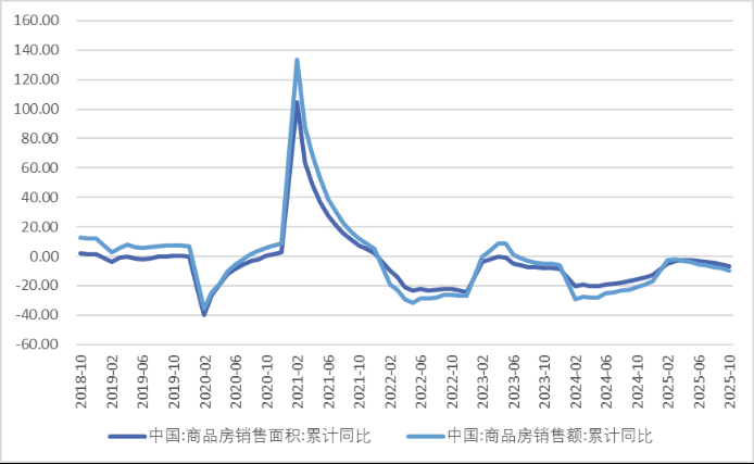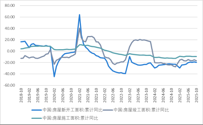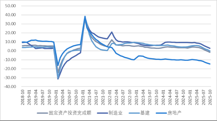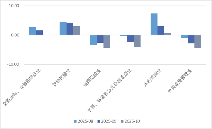 二、投资端集体回落,地产景气显疲弱。1-10月份,全国固定资产投资(不含农户)408914亿元,同比下降1.7%;扣除房地产开发投资,全国固定资产投资增长1.7%,增速均较上月明显回落。基础设施投资同比下降0.1%(上月增长1.1%),制造业投资增长2.7%(4%),房地产开发投资下降14.7%(-13.9%),基建、制造业稳连续多月下降,地产景气度依旧疲软。受到反内卷政策影响,部分传统行业投资增速预计承压,但对于高技术产业而言影响预计有限,更有可能出现资源向高技术制造业倾斜的情况,但由于传统产业整体占比仍较大,制造业投资仍有阶段性承压的可能。政策性工具投放存在时滞,基建增速有望探底回升。10月份各基建相关行业均较上月走弱,铁路仍是基建主导,而道路和公共设施成为较大拖累。10月末发改委表示,新设的5000亿政策性金融工具已全部投放完毕,但由于资金投放后到形成实物工作量仍需一定时间,因此,短期内效果并未显现。此外,随着地方政府化债进入关键阶段,也对专项债的使用产生挤占,同样拖累基建投资增速下行。后续随着5000亿政策性金融工具发挥作用,基建增速有望触底。
