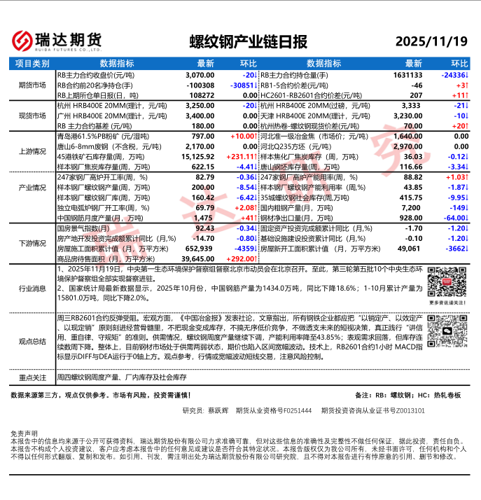 2、国家统计局最新数据显示,2025 年 10 月份,中国钢筋产量为 1434.0 万吨,同比下降 18.6%;1-10 月累计产量为 15801.0 万吨,同比下降 2.0%。