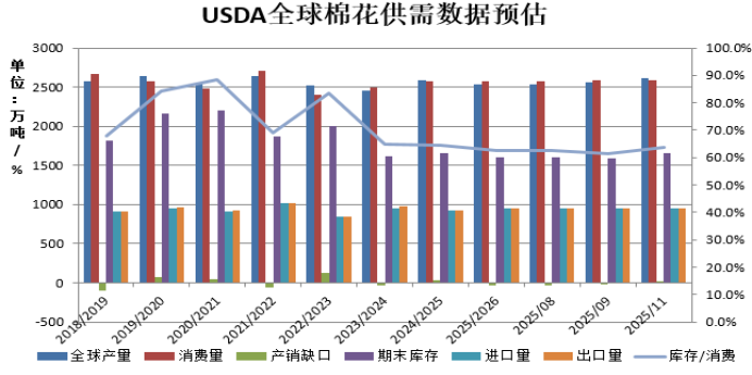 美国农业部发布全球棉花供需11月报告,报告显示,2025/26年度全球棉花产量预测值为2611.4万吨,较前期调增52.2万吨。全球消费调增1.1万吨至2588.3万吨,全球期初库存预估增加9.3万吨至1621.8万吨,期末库存调增60.8万吨至1653.2万吨。