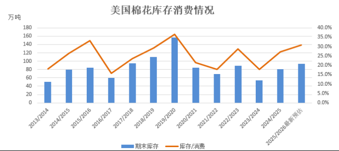 2025/26年度美国棉花供需前景显示,与9月相比,产量、出口和期末库存均有所增加,而消费和进口量保持不变,产量增加的部分流向期末库存,期末库存量增加了近20%。