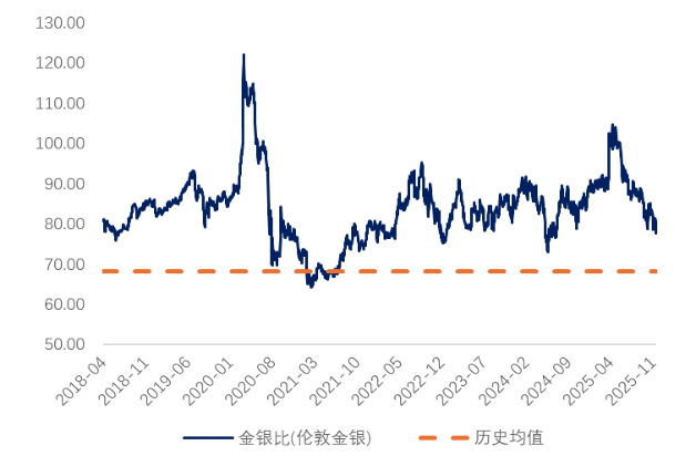 展望未来,12月重启降息已成为当前市场的主流预期,有望继续提振市场看多情绪。然而,考虑到白银年内累计涨幅已超过90%,且月线RSI指标显示市场已进入严重超买区间,短期内投资者对宏观消息的敏感度可能显著上升。任何不及预期的宏观数据或消息,均可能放大贵金属市场的回调风险。当前金银比已回落至10月初约78的水平,虽较年初逾100的高位明显下行,但仍高于约68的历史均值,显示其仍存在一定的修复空间。若本轮降息预期能够持续兑现,市场围绕金银比修复的交易逻辑或将继续强化。综合来看,在降息预期升温、白银库存持续处于低位以及工业需求保持韧性的多重因素共振下,预计白银价格将延续震荡偏强走势。