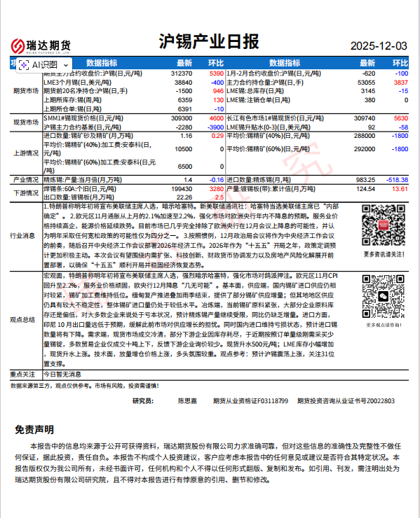 宏观面,特朗普称明年初将宣布美联储主席人选,强烈暗示哈塞特,强化市场对鸽派押注。欧元区11月CPI回升至2.2%,服务业价格顽固,欧央行12月降息“几无可能”。基本面,供应端,国内锡矿进口供应仍相对较紧,锡矿加工费维持低位。缅甸复产推进叠加雨季结束,提供了部分锡矿供应增量;但其地地区供应仍具有较大不稳定性,整体锡矿进口量仍处于较低水平。冶炼端,当前锡矿原料紧张,大部分企业原料库存还是偏低,对大多数企业来说处于亏本状况,预计精炼锡产量继续受限,同比仍缺乏增量。进口方面,印尼 10 月出口量远低于预期,缓解此前市场对供应增长的担忧。同时国内进口维持亏损状态,预计进口锡数量将有下降。需求端,现货市场成交冷清,部分下游企业因库存耗尽,于近期按照订单量级刚需采买少量锡锭,多数贸易企业仅成交十吨上下,反馈下游企业询价较少。现货升水500元/吨;LME库存小幅增加,现货升水上涨。技术面,放量增仓价格上涨,多头氛围较重。观点参考:预计沪锡震荡上涨,关注31万位置支撑。