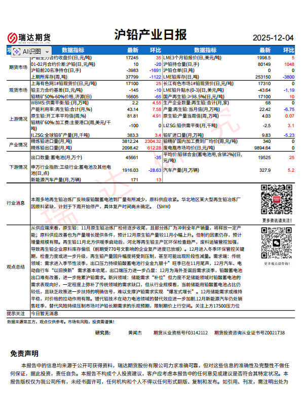 从供应端来看,原生铅:11月原生铅冶炼厂检修逐步收尾,且部分炼厂为冲刺全年产销量,将释放一定产能;原料供应改善也为产量增长提供条件,预计12月原生铅产量较11月小幅上升。但制约因素仍存,预计增量规模有限。再生铅11月北方供暖季启动后,河北等再生铅主产区环保检查趋严,废料运输管控加强,导致再生铅企业原料库存偏低(前期受770号文影响的企业复产进度已放缓)。12月进入冬季环保管控关键期,检查力度或进一步升级,再生铅产量回升幅度将受到压制,甚至可能出现阶段性减量。需求端:传统领域:需求进入季节性淡季,出口压力持续铅酸蓄电池行业金九银十”旺季已在11月尾声,12月汽车、电动自行车“以旧换新” 需求基本收尾,出口端压力进一步凸显:12月为海外圣诞后需求淡季,铅酸蓄电池出口难有改善,进一步拖累沪铅需求。新兴领域:储能需求“补位”但力度不足储能领域对铅酸蓄电池的需求表现向好,一定程度上弥补了传统领域的需求缺口,但从行业规模看,当前储能用铅酸蓄电池占比仍较低,且缺乏政策进一步扶持的明确信号,难以支撑沪铅需求实现 “爆发式增长”。12月储能需求或维持平稳,对价格的拉动作用有限。锂代铅技术在动力电池领域的替代效应进一步加剧.12月新能源汽车仍处销售旺季,替代风险持续压制市场对沪铅长期需求的乐观预期,限制期价上行空间。关注上方17500压力位。